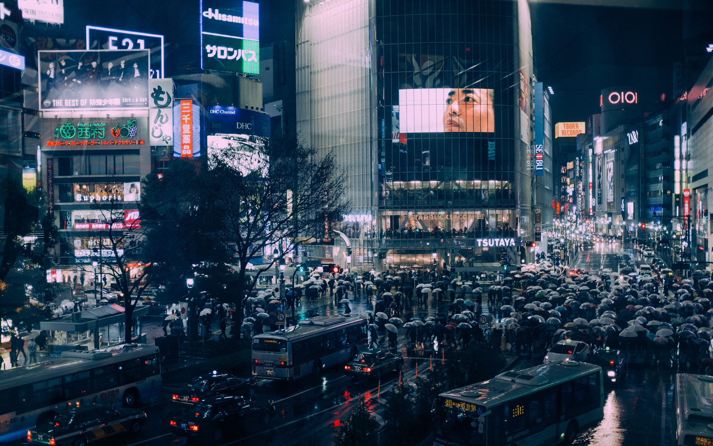 Le célèbre carrefour de Shibuya et son balai incessant de parapluies