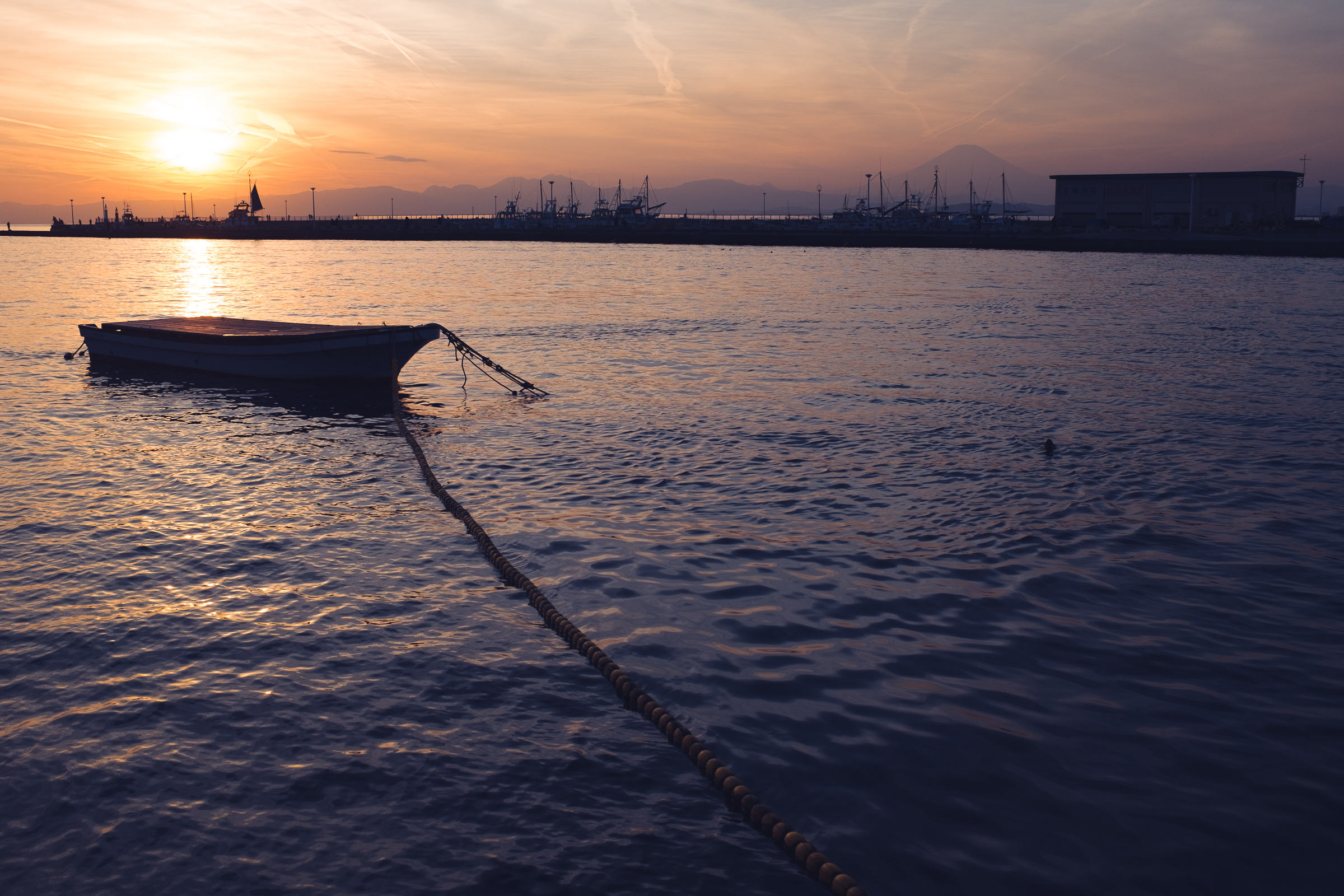 Le soleil se couche, une barque flotte